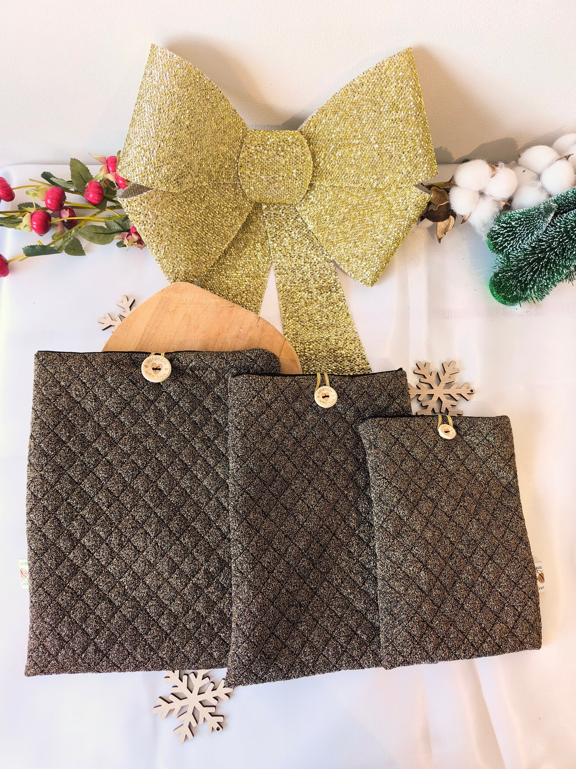 Cousue à la main dans un tissu noir délicatement pailleté, elle protège vos livres et liseuses comme un petit écrin scintillant.