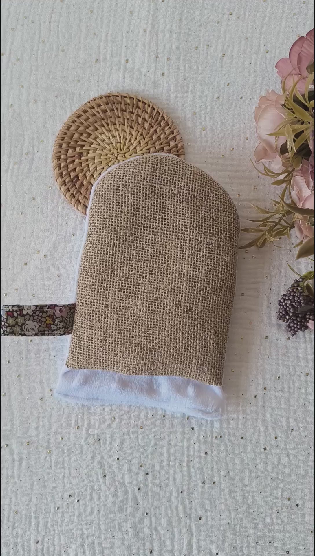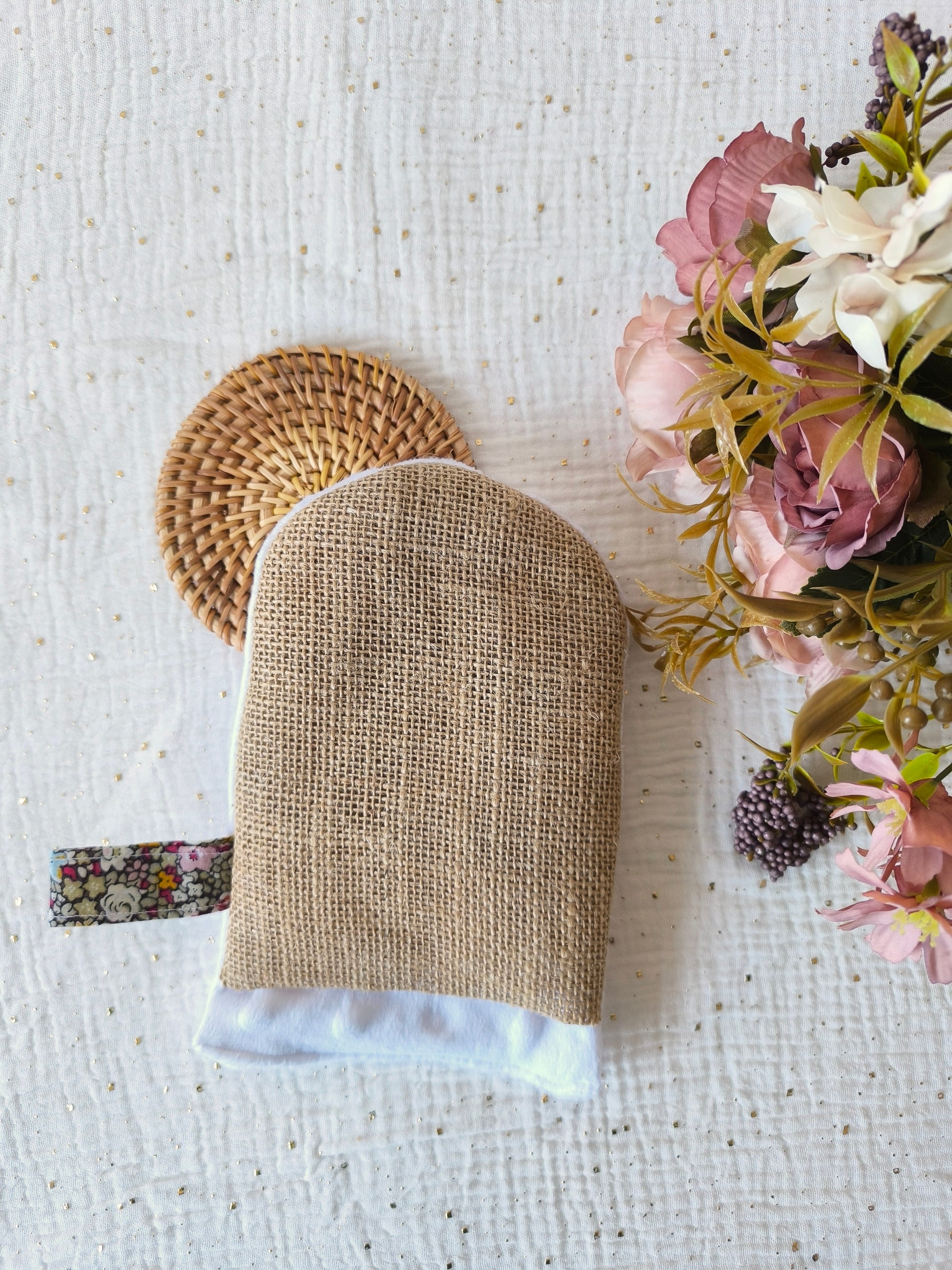 Gant de toilette exfoliant pour le corps avec une face en toile de jute naturelle et une face en tissu minky