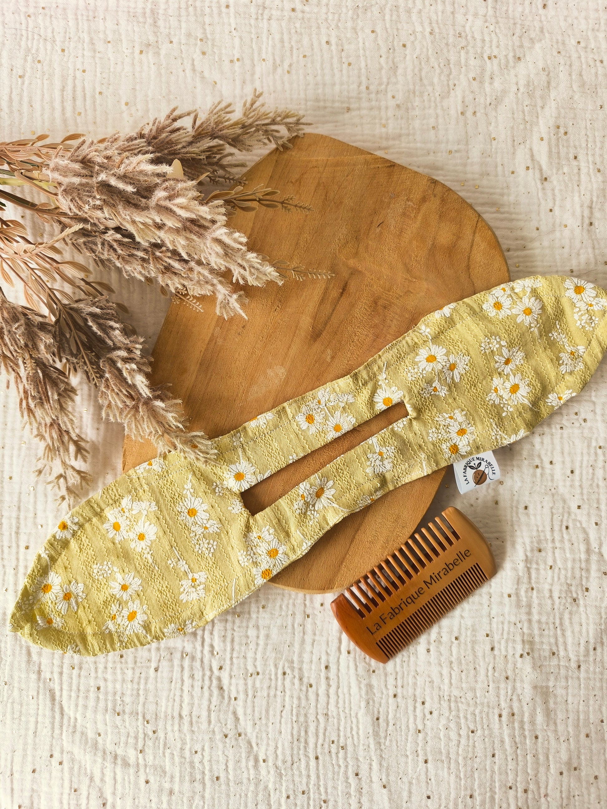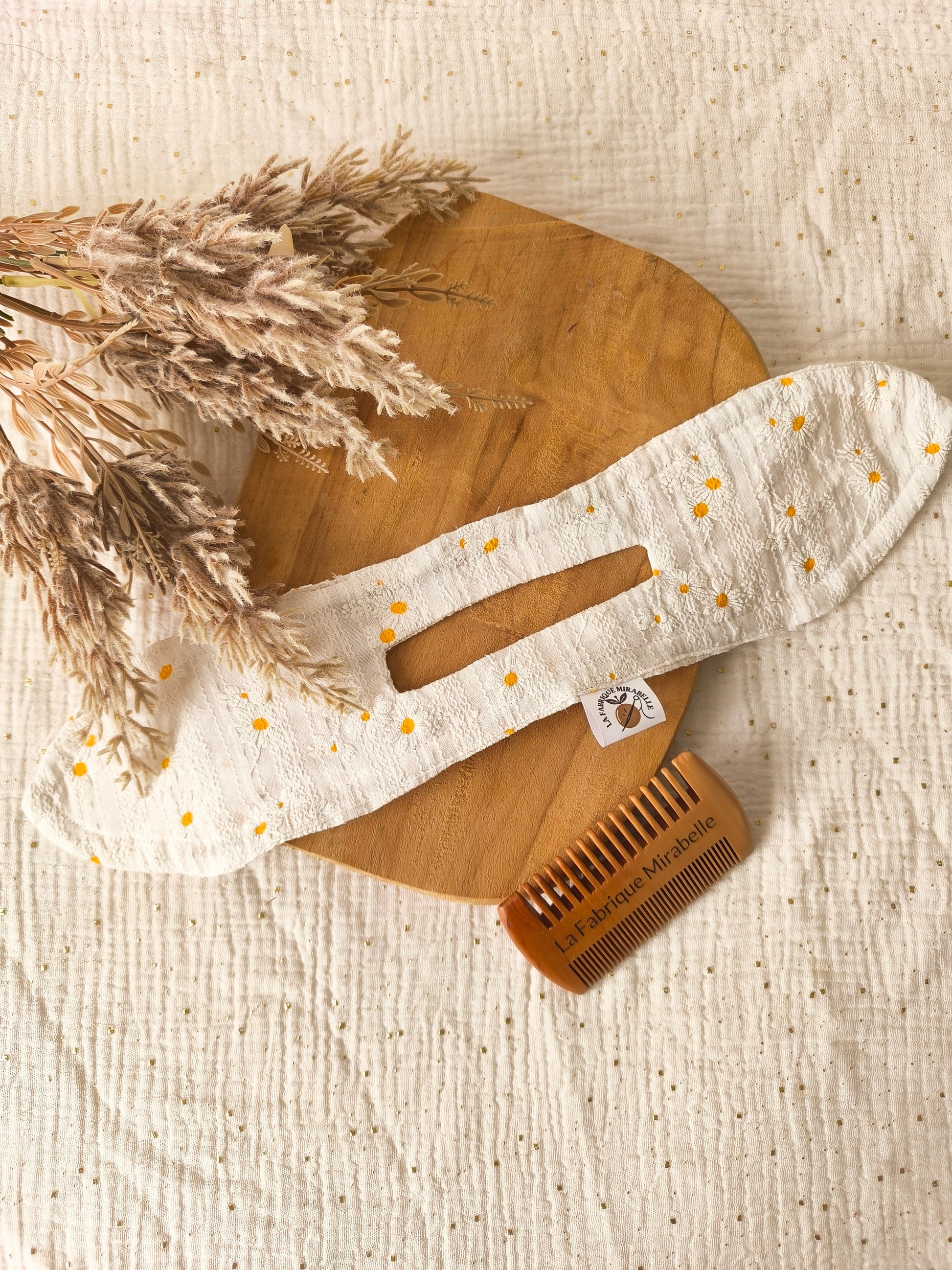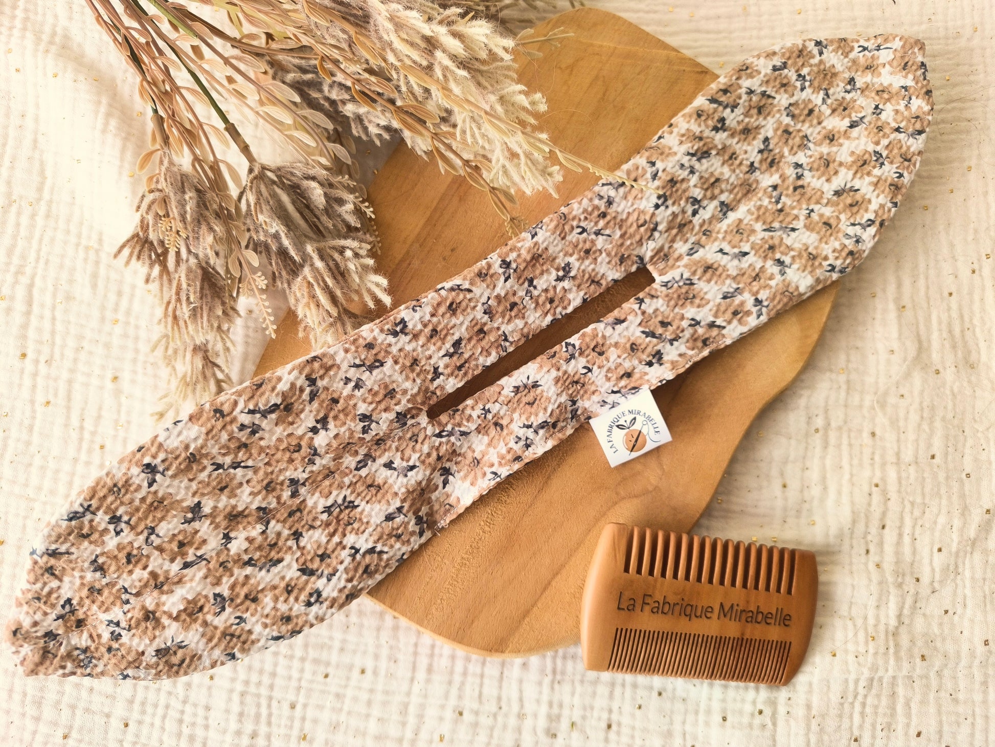 Confectionné avec amour dans notre atelier, ce chouchou rigide est renforcé par un fil discret qui permet de le nouer facilement autour de vos cheveux, pour créer un joli chignon roulé.