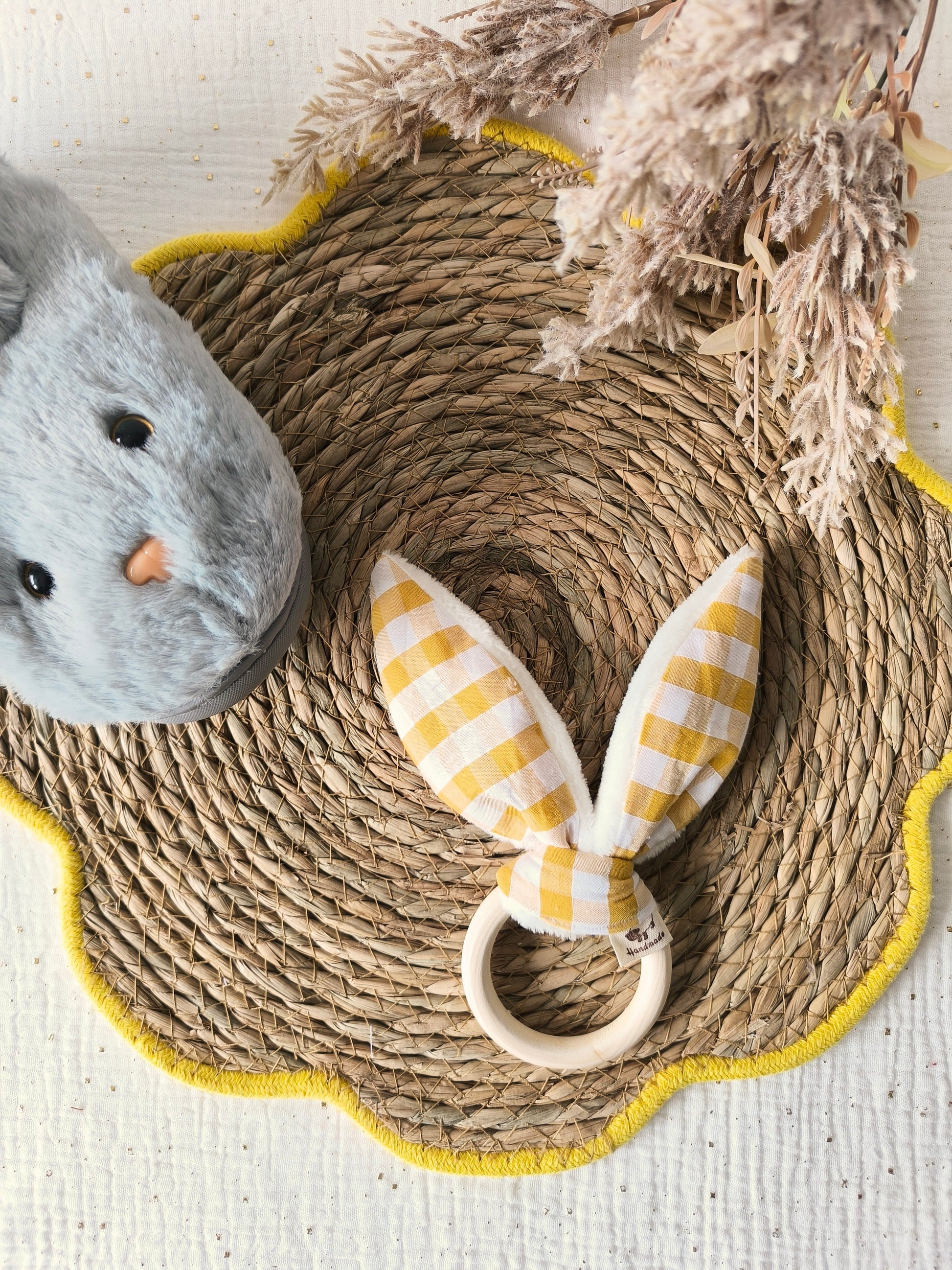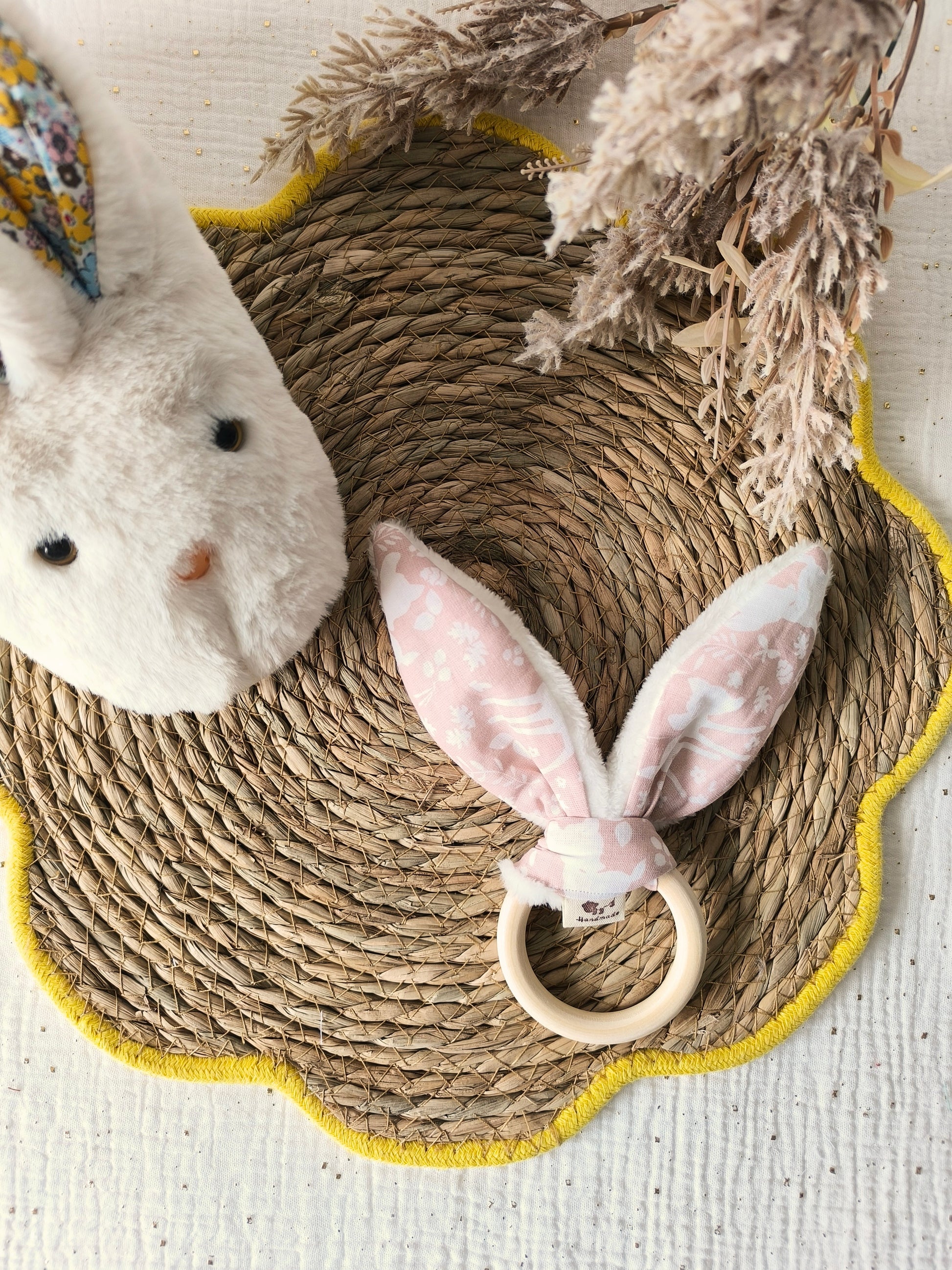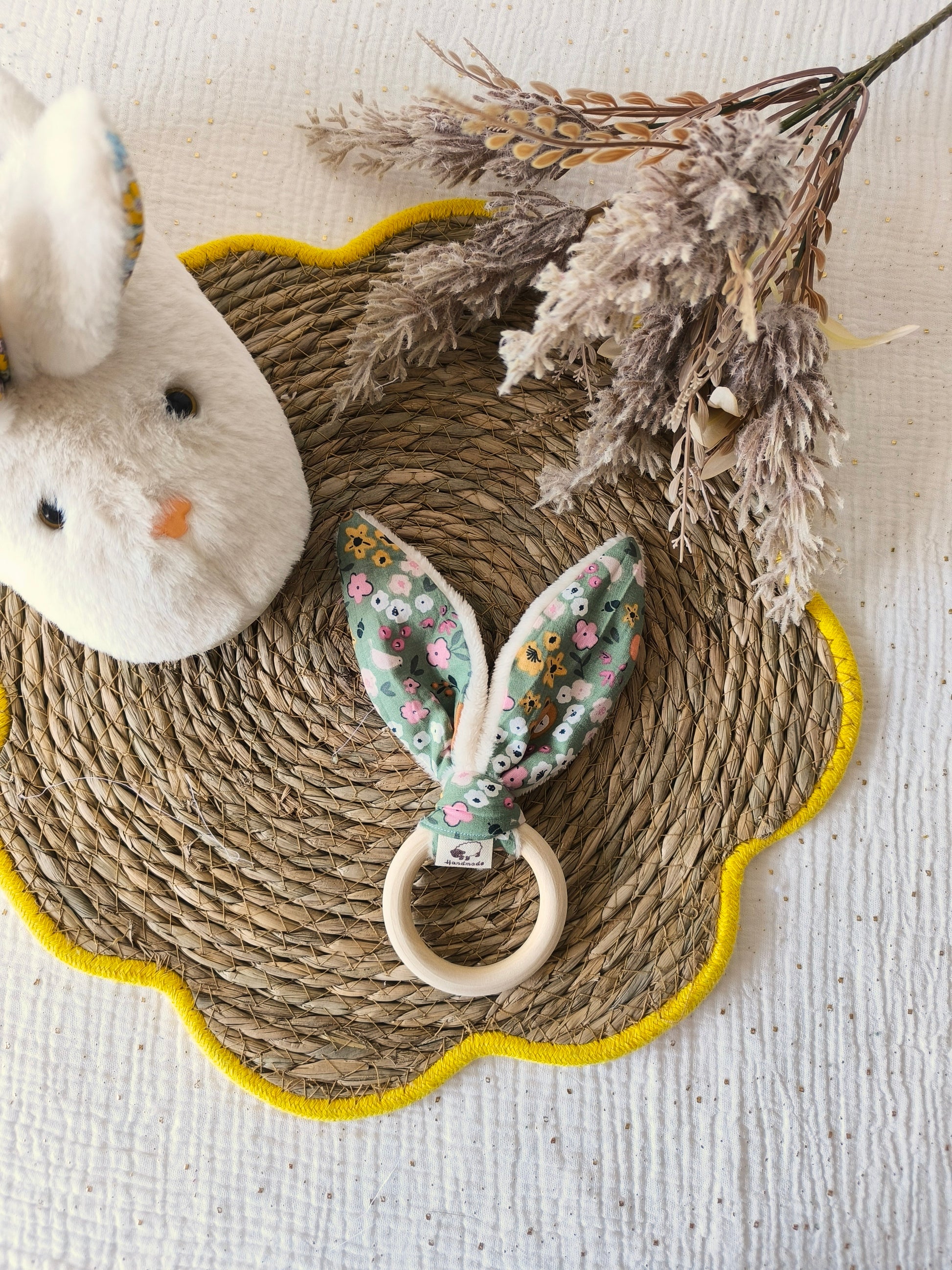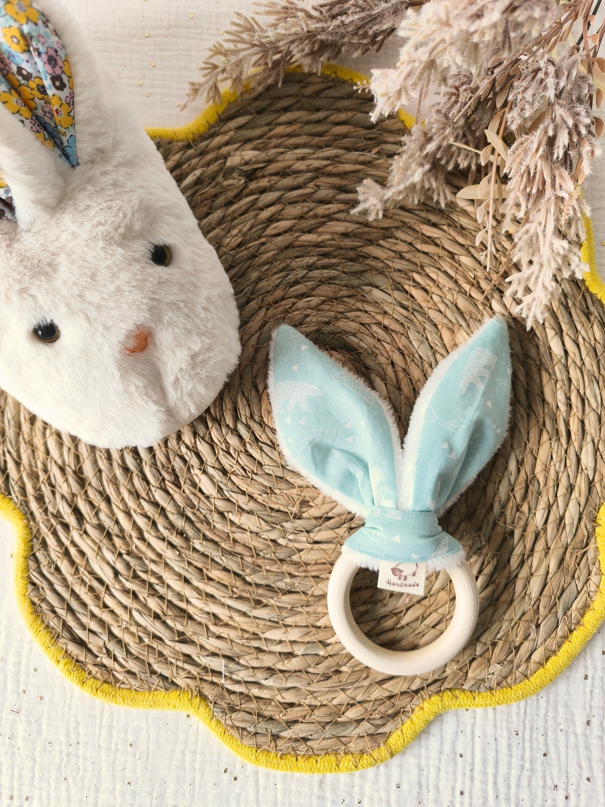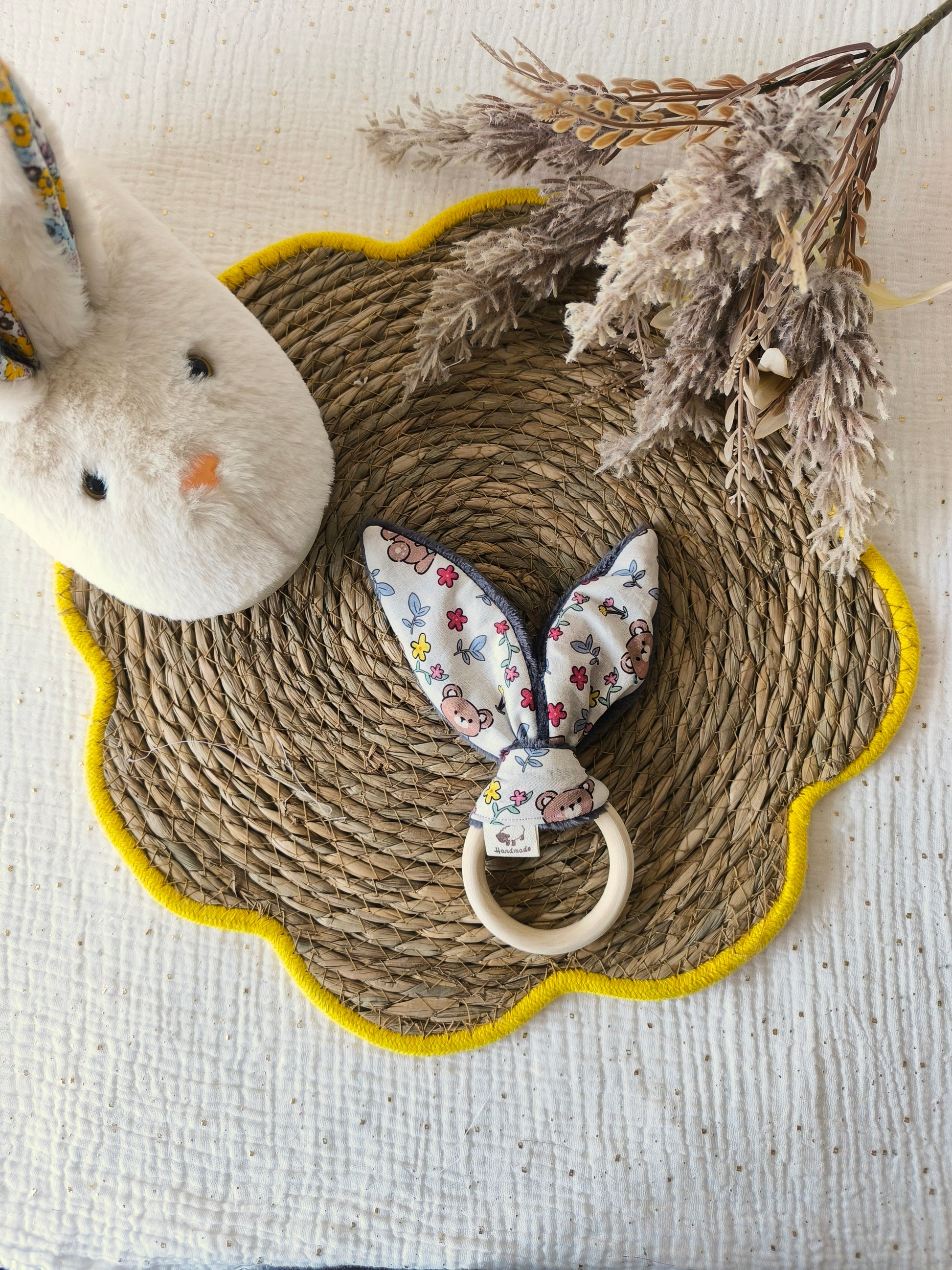 Son anneau en bois naturel est idéal pour soulager les gencives, tandis que ses oreilles en polaire doudou et coton offrent une texture ultra douce et apaisante à câliner 🧸.