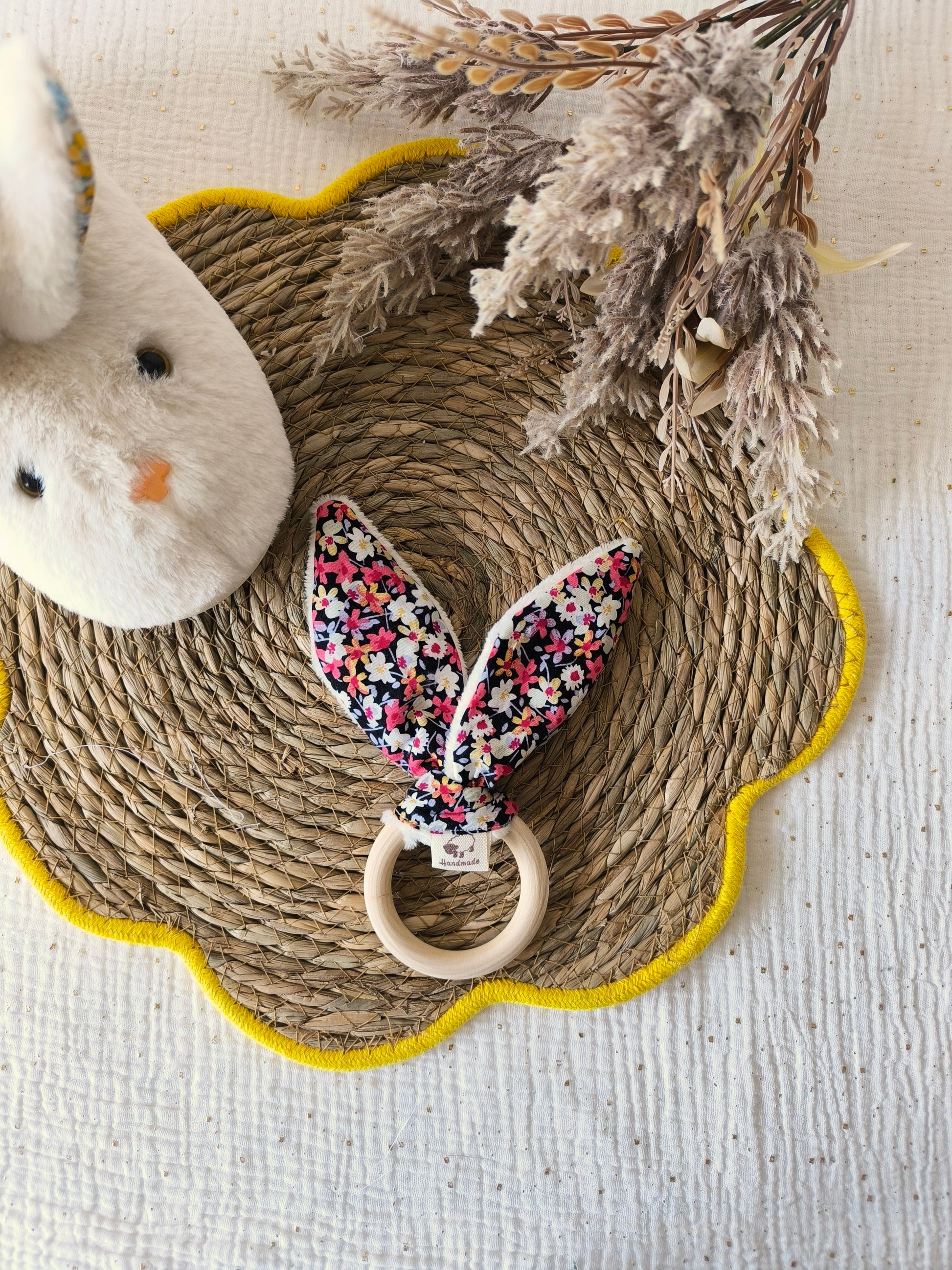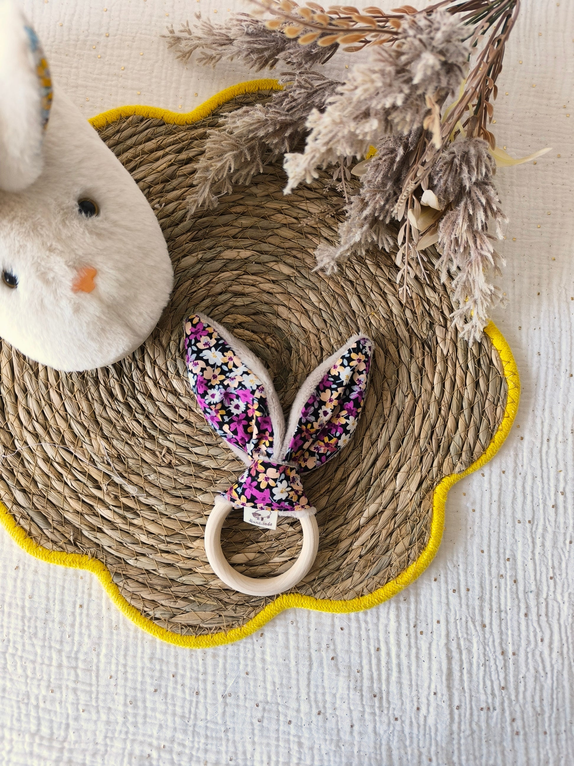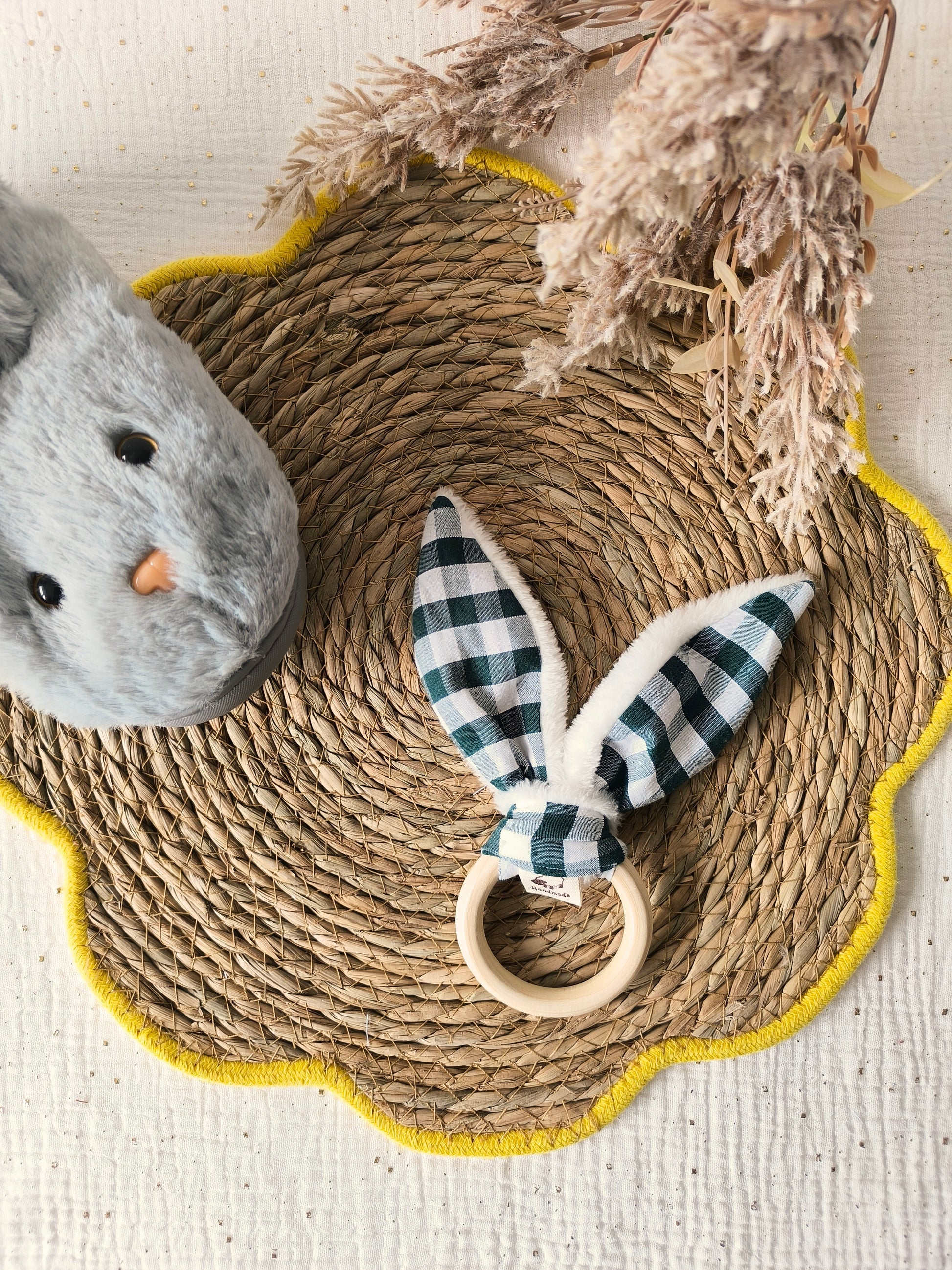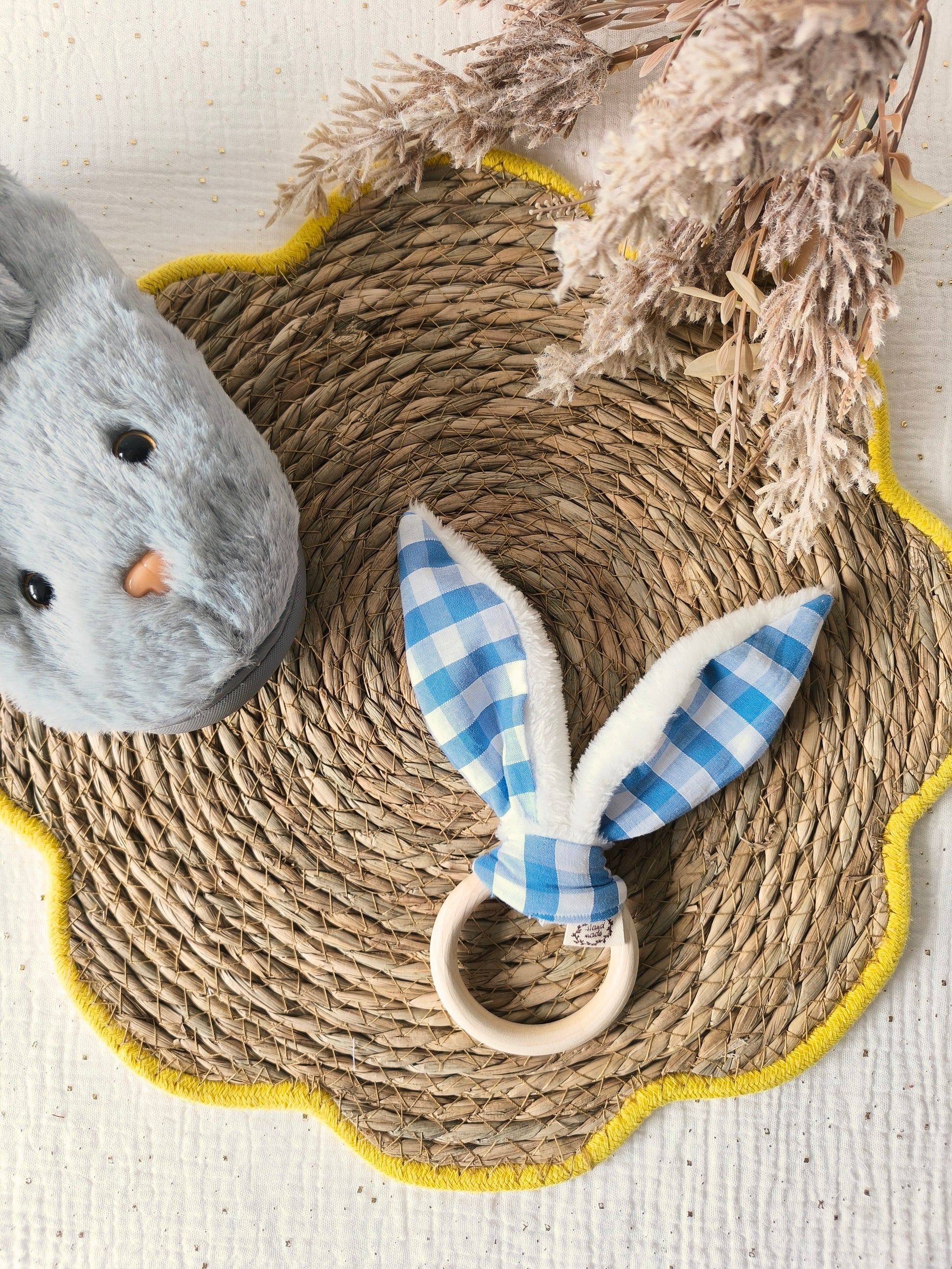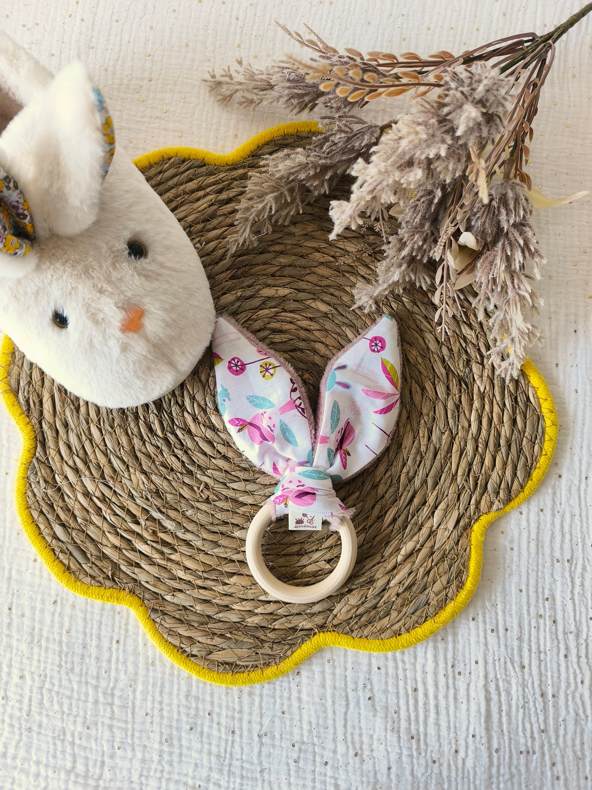 Son anneau en bois naturel est idéal pour soulager les gencives, tandis que ses oreilles en polaire doudou et coton offrent une texture ultra douce et apaisante à câliner 🧸.