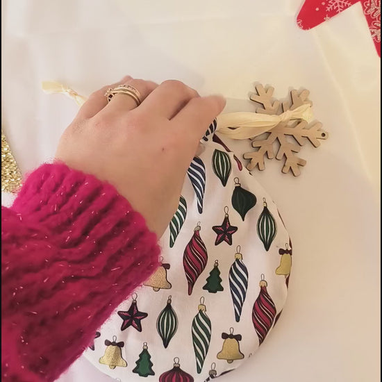 Un petit écrin textile tout doux, cousu avec soin dans l’atelier, et décliné en forme de sapin 🎄 ou de boule de Noël. Chaque pochon est doublé, pensé pour être réutilisé d’année en année, et pour accompagner les moments précieux de décembre 🎀