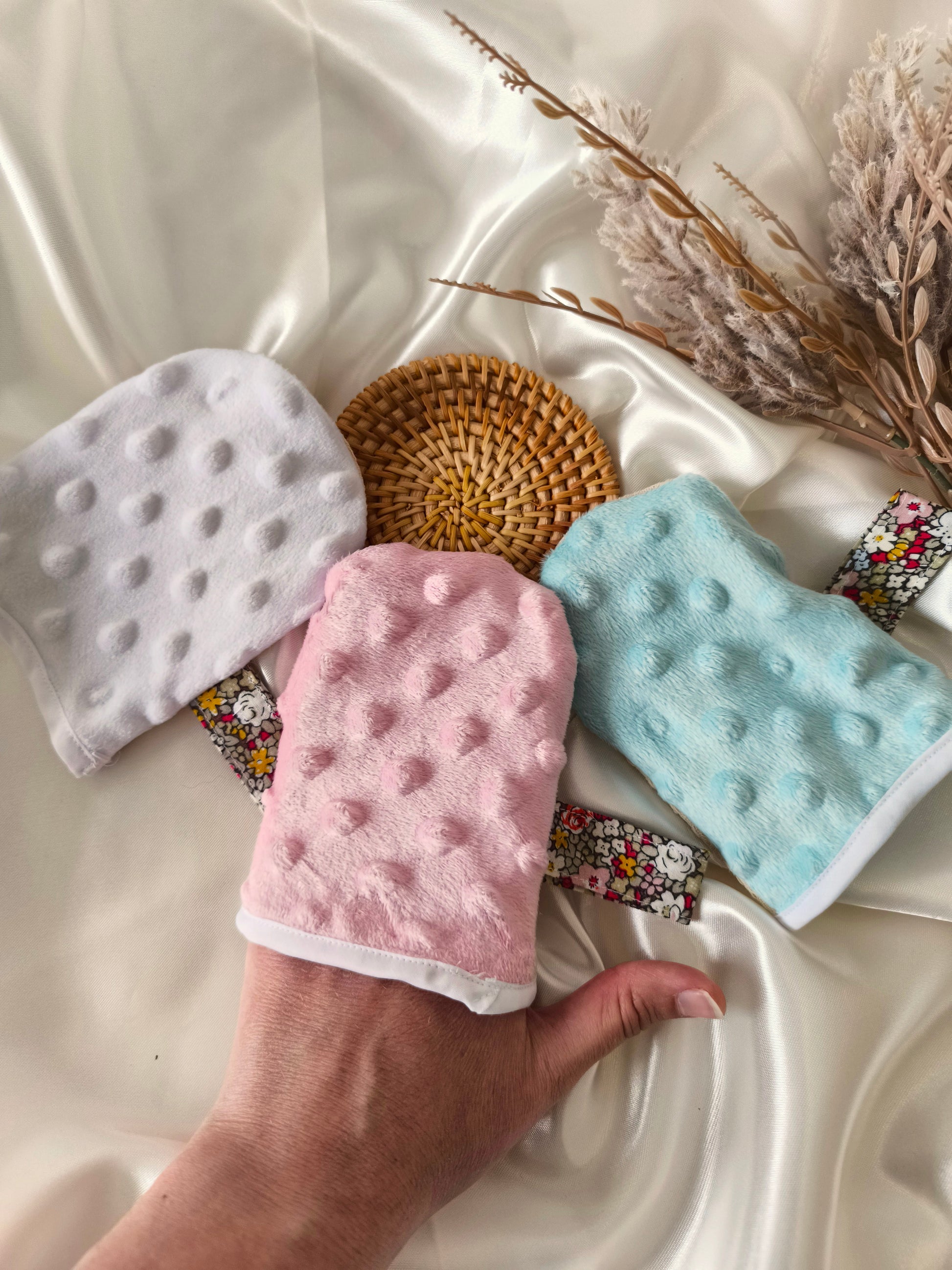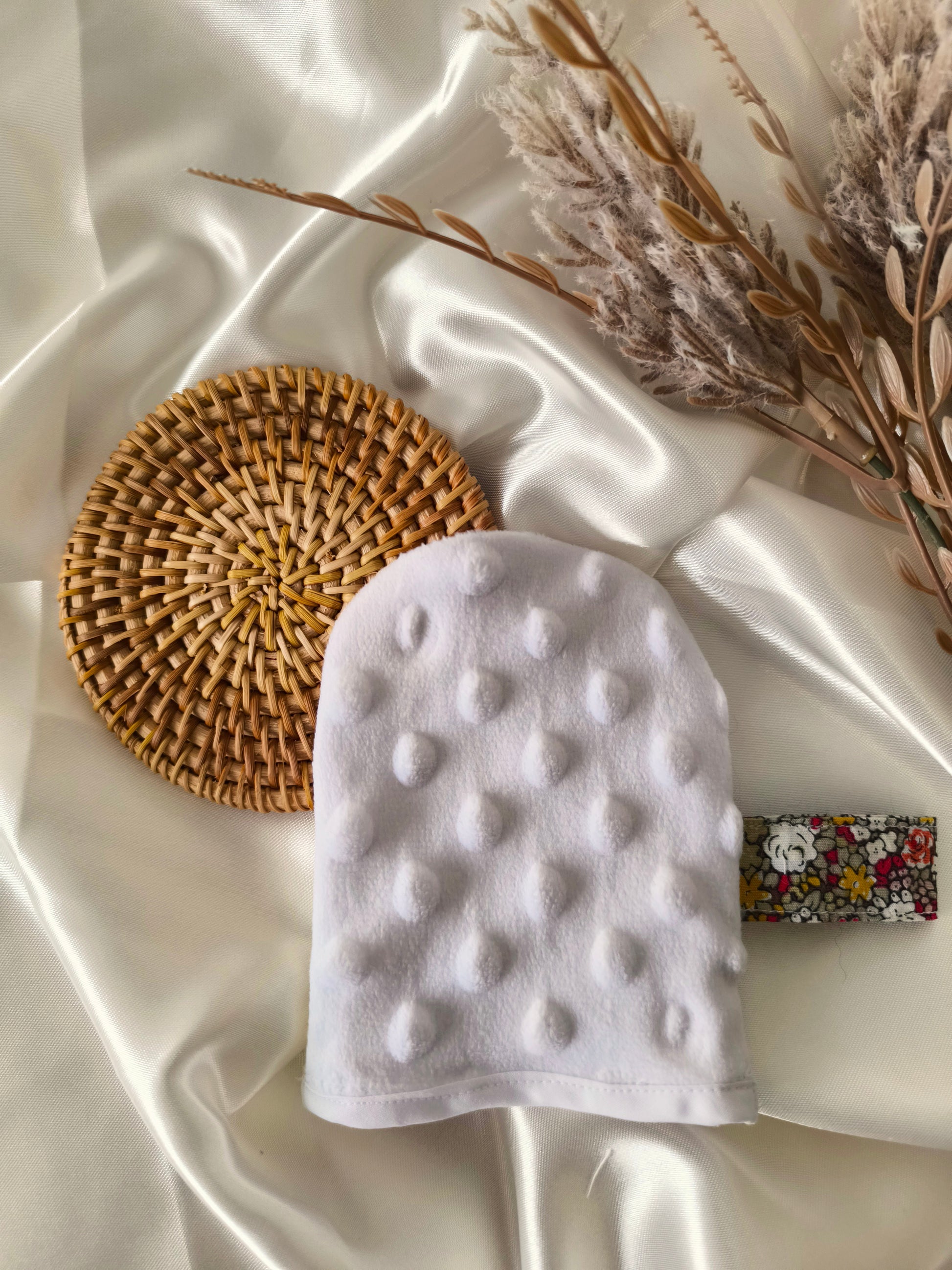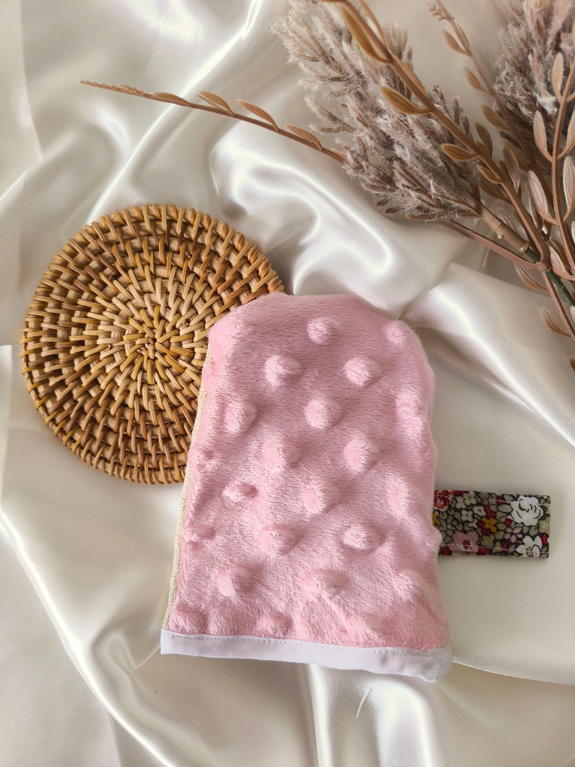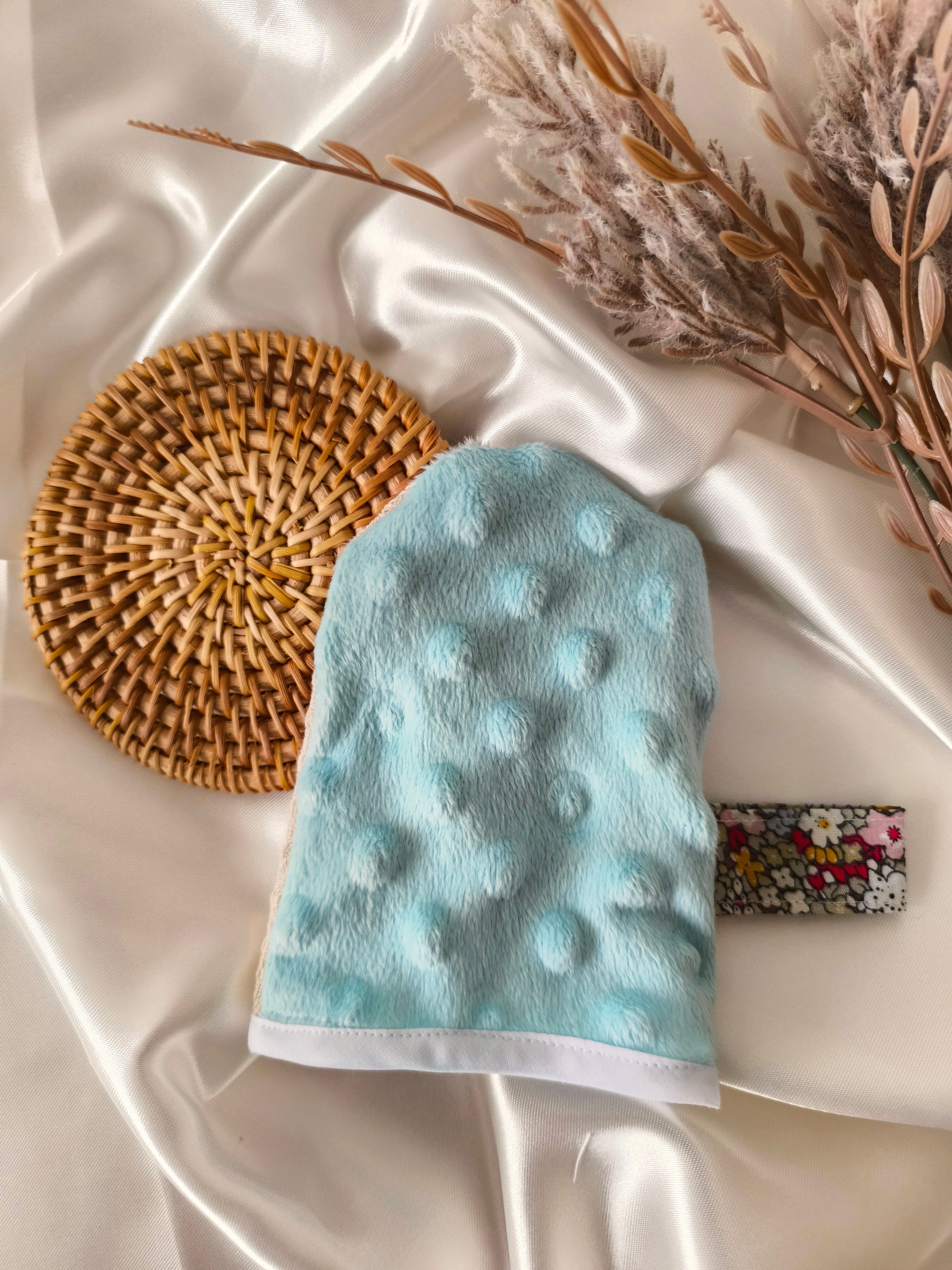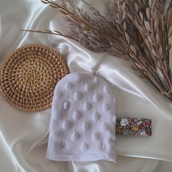 Mini gant de toilette exfoliant pour le visage avec une face en tissu nid d’abeille et une face en tissu minky