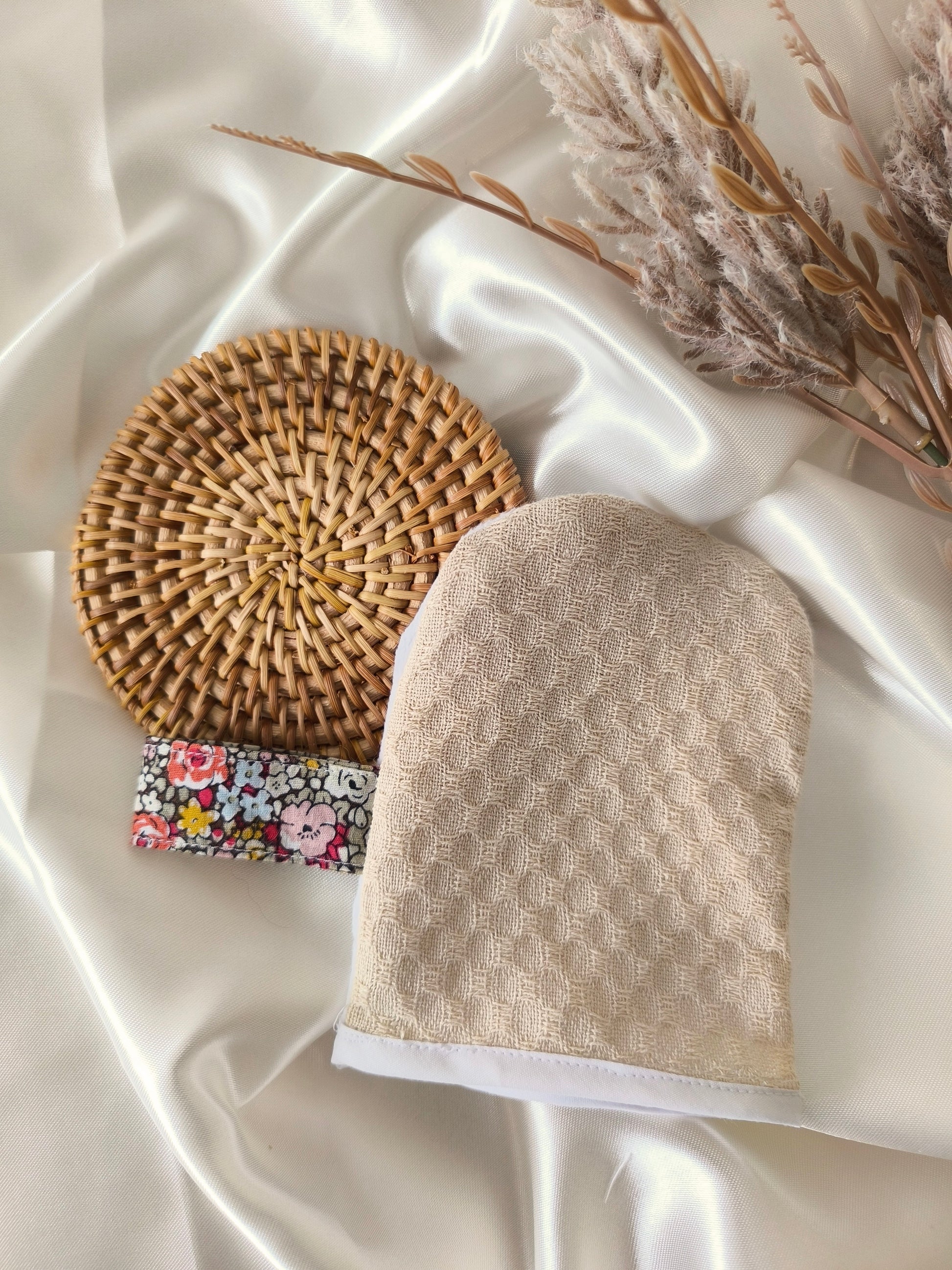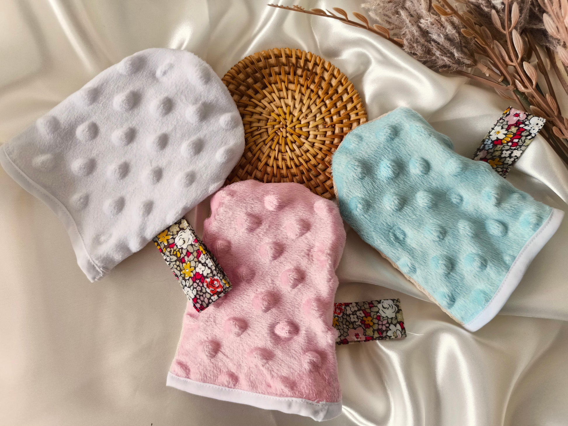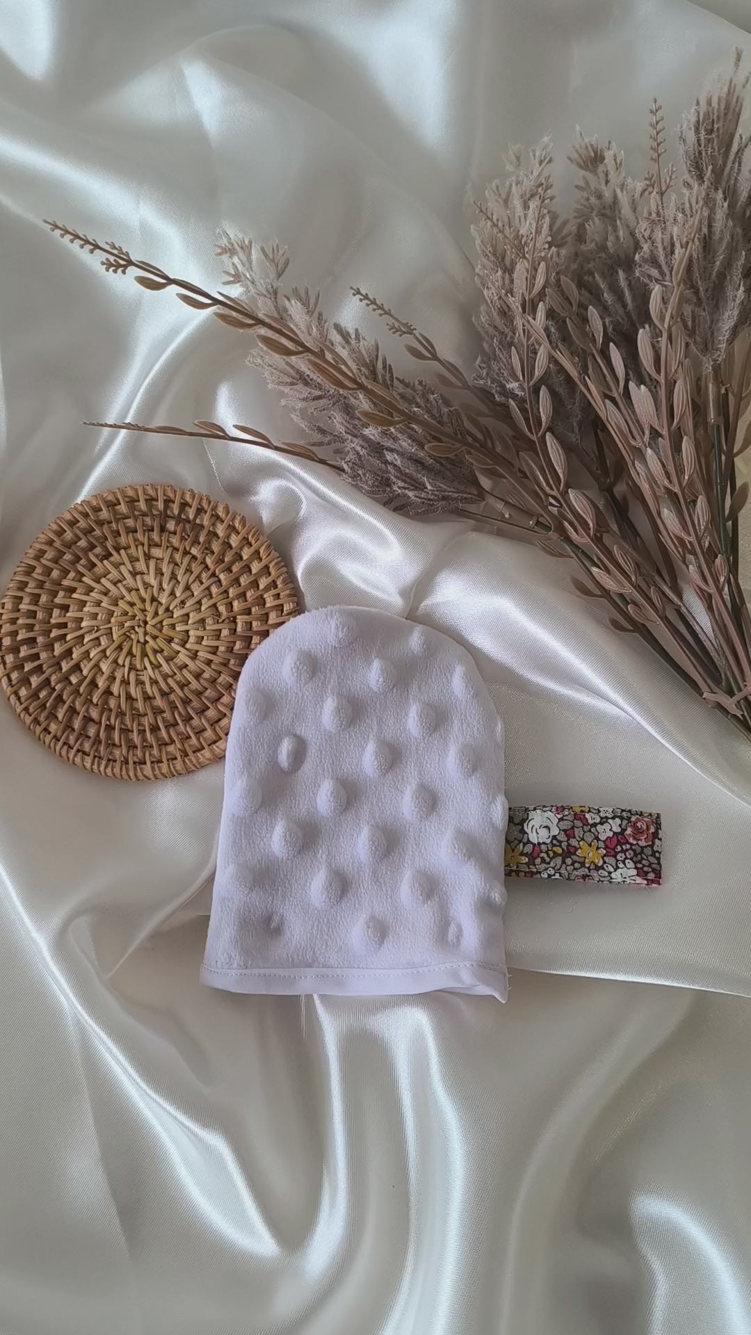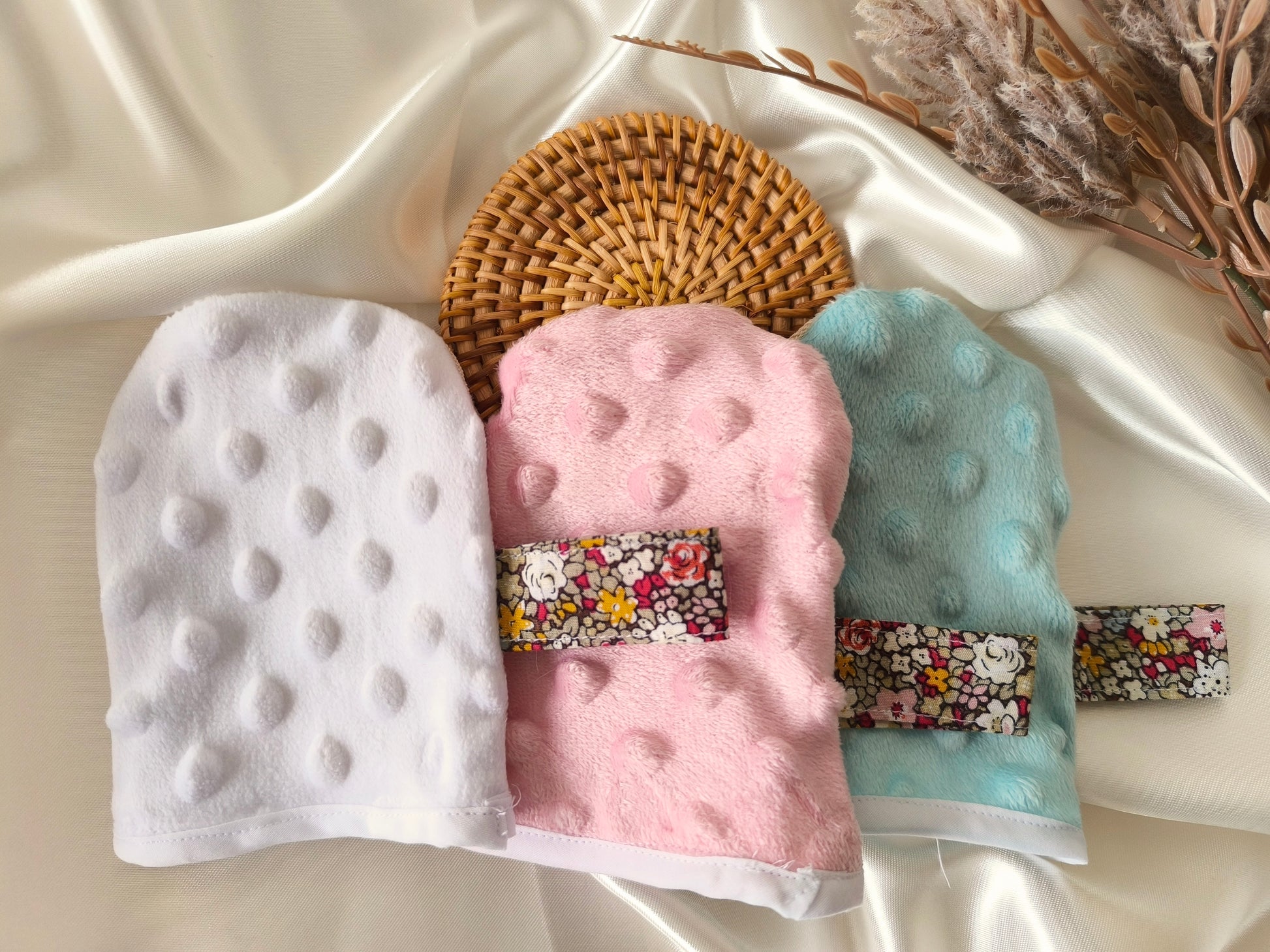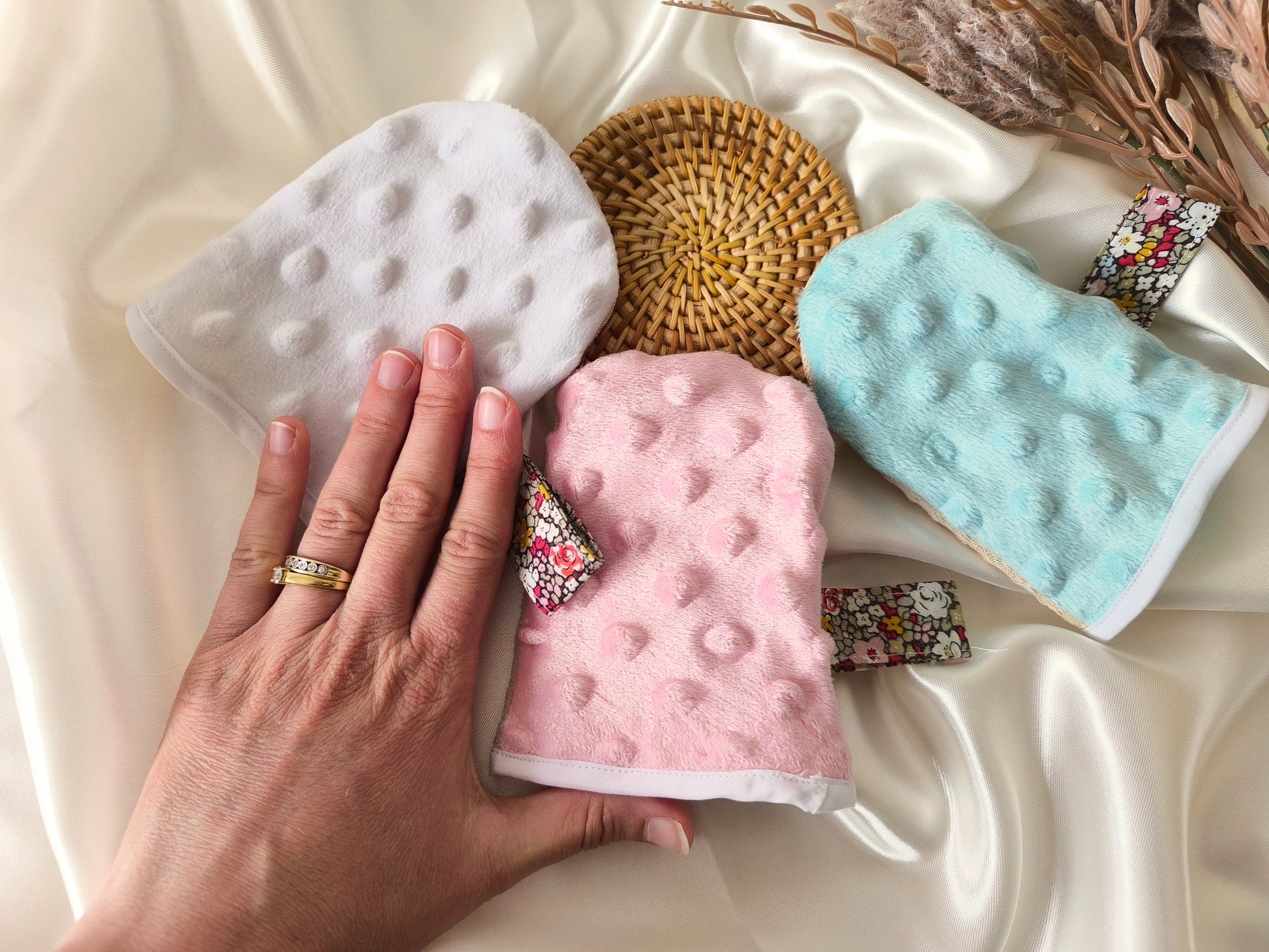 Mini gant de toilette exfoliant pour le visage avec une face en tissu nid d’abeille et une face en tissu minky